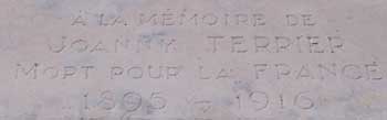 "A la mémoire de Joanny Terrier, Mort pour la France,