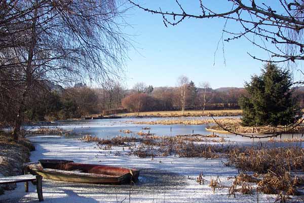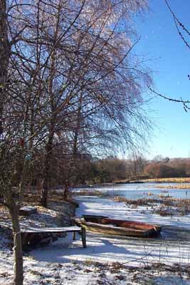 - Ce petit étang gelé et la barque semblent attendre le