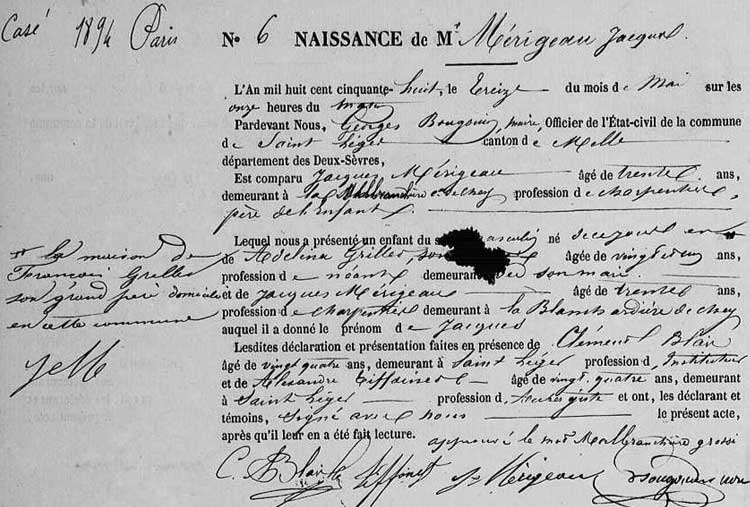 Mérigeau naît le 13 mai 1858 à Saint Léger