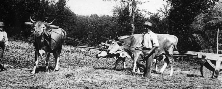 tiré par des bufs : quatre bufs sur la loco,