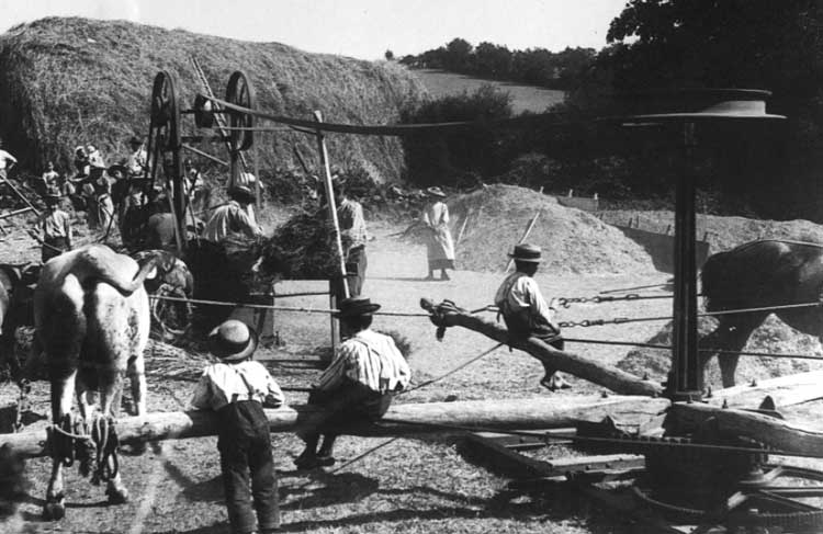 quatre bufs sur la batteuse et un cheval sur le monte-paille.