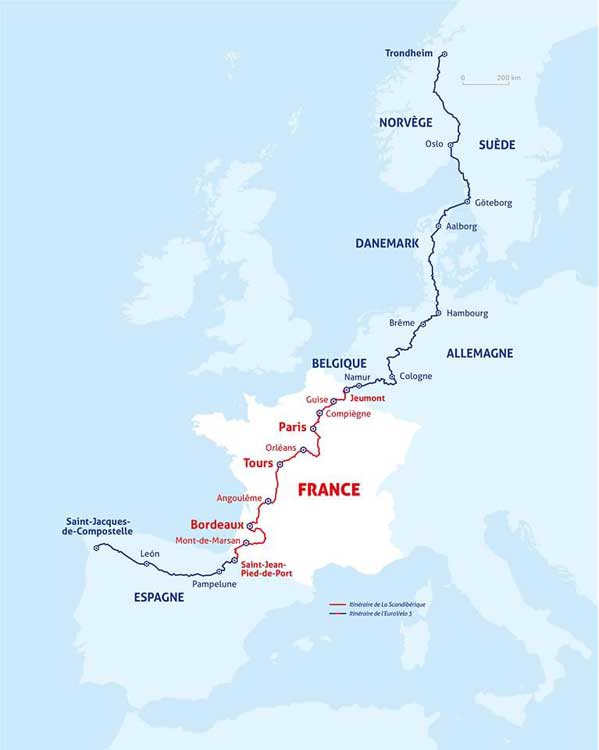 Compostelle en Espagne, le tout traversant 7 pays : Norvège,