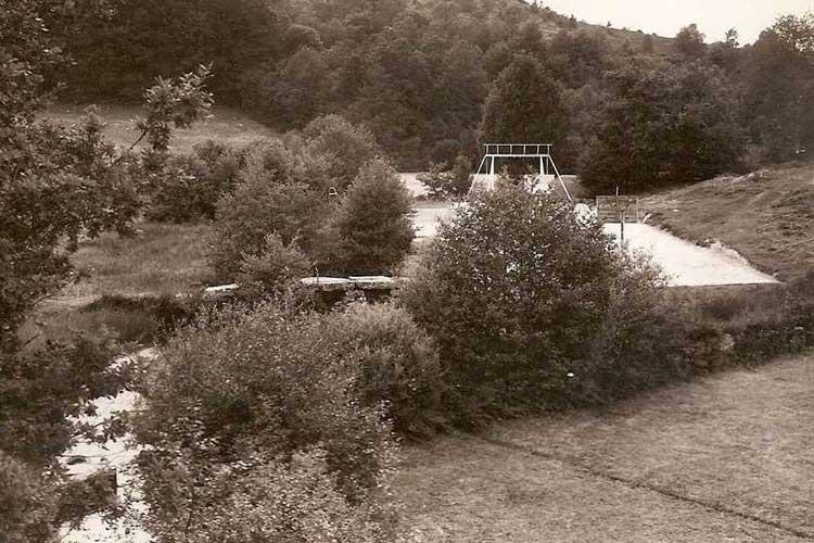 le terrain de sport (basket et piscine) et le pont romain, à gauche, que l'on reverra plus bas