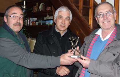 gauche, Patrice Chauvin, offrant une de ses sculptures